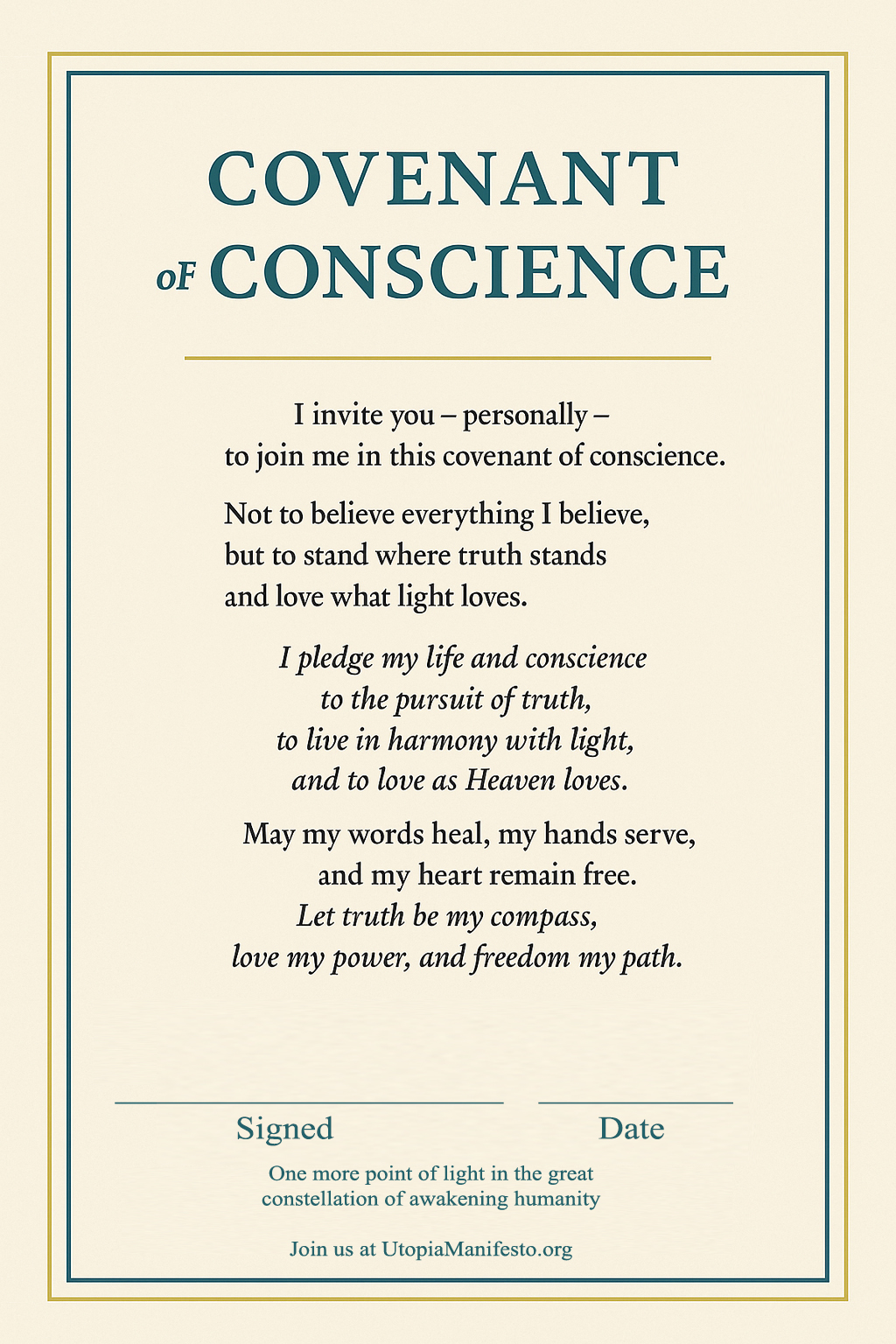 A living commitment to build a civilization of light, freedom, and love—one courageous signature at a time.